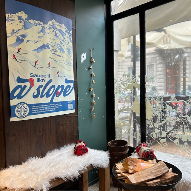 ミラノ市内にある主にパスタやピザを提供しているチェーン店。オリンピック開催前から店内はまさに山小屋のような雰囲気へと変身し、外壁にはスキー板が立てかけられ、都会にいながら山にいるように感じる装飾が施されていた。
